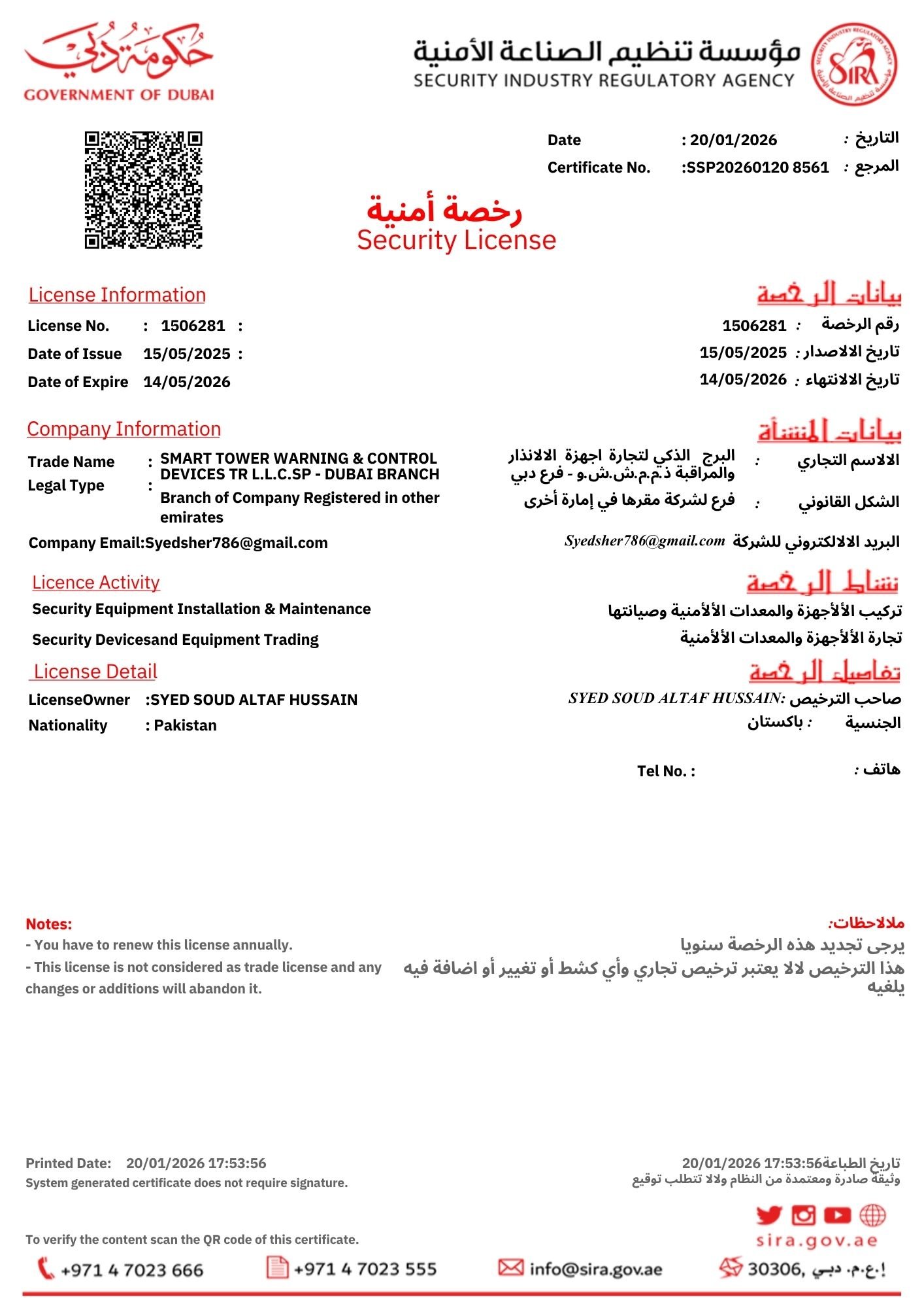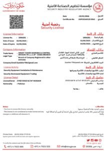 Smart Towers Security is a trusted, SIRA-approved company delivering fully compliant CCTV solutions across the emirate of Dubai. We work in alignment with Dubai Police, the Security Industry Regulatory Agency (SIRA), and the Ministry of Interior UAE to provide certified security camera installation and CCTV installation certificates. Our team follows strict technical and installation standards for commercial properties, hotels, banks, retail outlets, warehouses, and residential installations. Supporting the UAE’s vision of becoming the safest country, we ensure surveillance in public areas like entrances, parking lots, and elevators, while strictly respecting privacy laws and prohibiting monitoring of restricted private spaces or audio recording without consent.